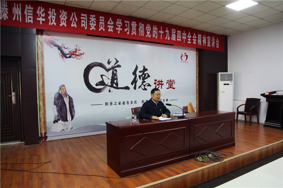 为深入学习宣传贯彻党的十九届四中全会精神,按照市委的统一部署,12月3日,滕州PA视讯投资控股公司举办学习贯彻党的十九届四中全会精神宣讲会,公司党委书记、董事长徐俊同志主持宣讲会并进行宣讲。公司领导班子、总部全体人员、权属企业班子成员参加活动。