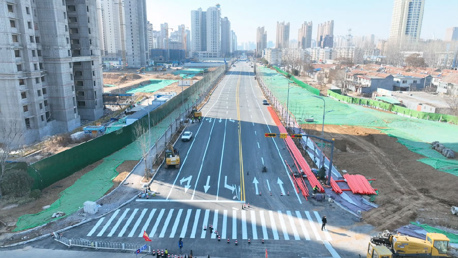施工现场,双向四车道的机动车道及非机动车道沥青铺设已经完成,机动车道交通标志线及路灯设施已经安装到位,目前已基本具备通车条件。