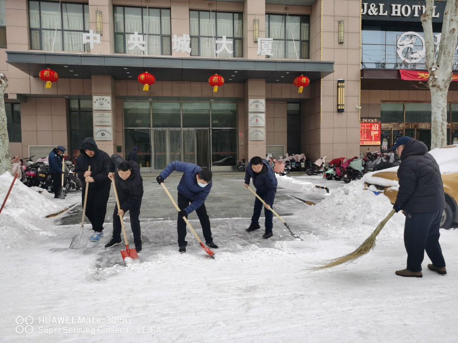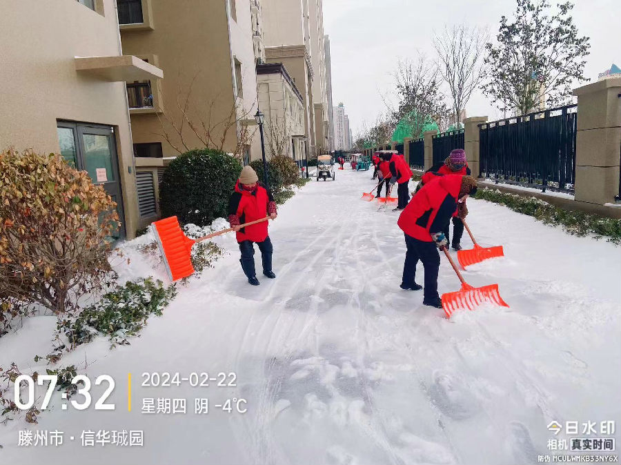 在工作场所,除雪志愿者清扫出一条条“安全通道”,最大限度减轻积雪对上班行人、车辆的影响,排除安全隐患,确保正常办公;在物业小区,腾程物业公司组织人员分别到缇香郡、PA视讯城、九里庭院等小区进行清雪除冰,现场有序分工、密切合作,为业主开辟出一道“平安路、暖心路”。