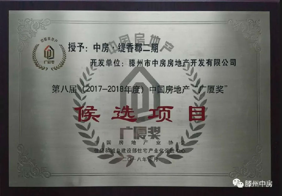 1、项目入围国家广厦奖。2018年6月22日,第八届(2017—2018年度)中国房地产“广厦奖”第四批候选项目颁牌仪式在青岛隆重举行,由中房开发公司开发建设的“中房缇香郡·璟园项目”获此殊荣。这是暨中房·缇香郡一期项目获得第七届国家“广厦奖”后再获此获得此奖项。