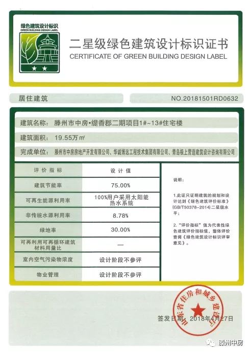 3、获山东省二星级绿色建筑标识2018年4月,经山东省住建厅评审,中房·缇香郡璟园项目获得居住建筑类二星级绿色建筑设计标识。