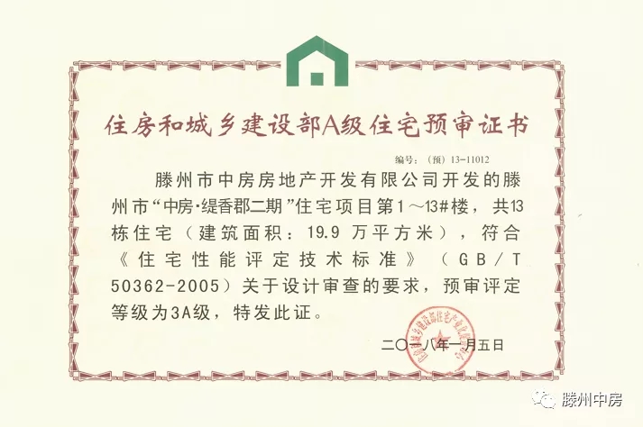 2、通过住建部“3A住宅性能认定”。2018年1月5日,中房·缇香郡璟园项目经国家住建部住宅性能认定专家组评审,项目在适用性能、安全性能、耐久性能、环境性能和经济性能等五项指标均符合国家《住宅性能评定技术标准》要求,认定项目通过国家住建部“3A住宅性能认定”初审。